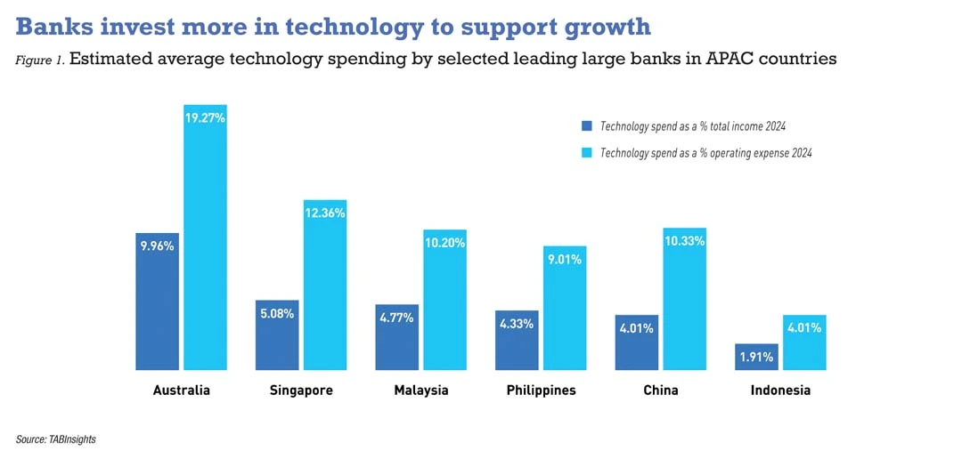 TABInsights research shows that leading large APAC banks are spending on average about 5% of total income on technology, led by markets such as Australia and Singapore.