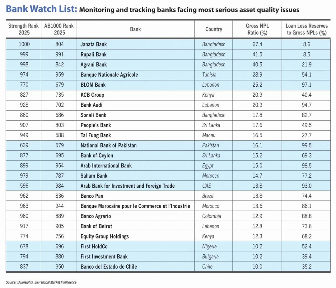 This year’s Bank Watch List includes four banks from Bangladesh, three from Lebanon, two from Sri Lanka, two from Kenya, two from Morocco, and one each from Brazil, Bulgaria, Chile, Colombia, Egypt, Macau, Nigeria, Pakistan, Tunisia and the UAE. Countries such as Bangladesh, Kenya, Lebanon and Sri Lanka continue to face notable challenges.
