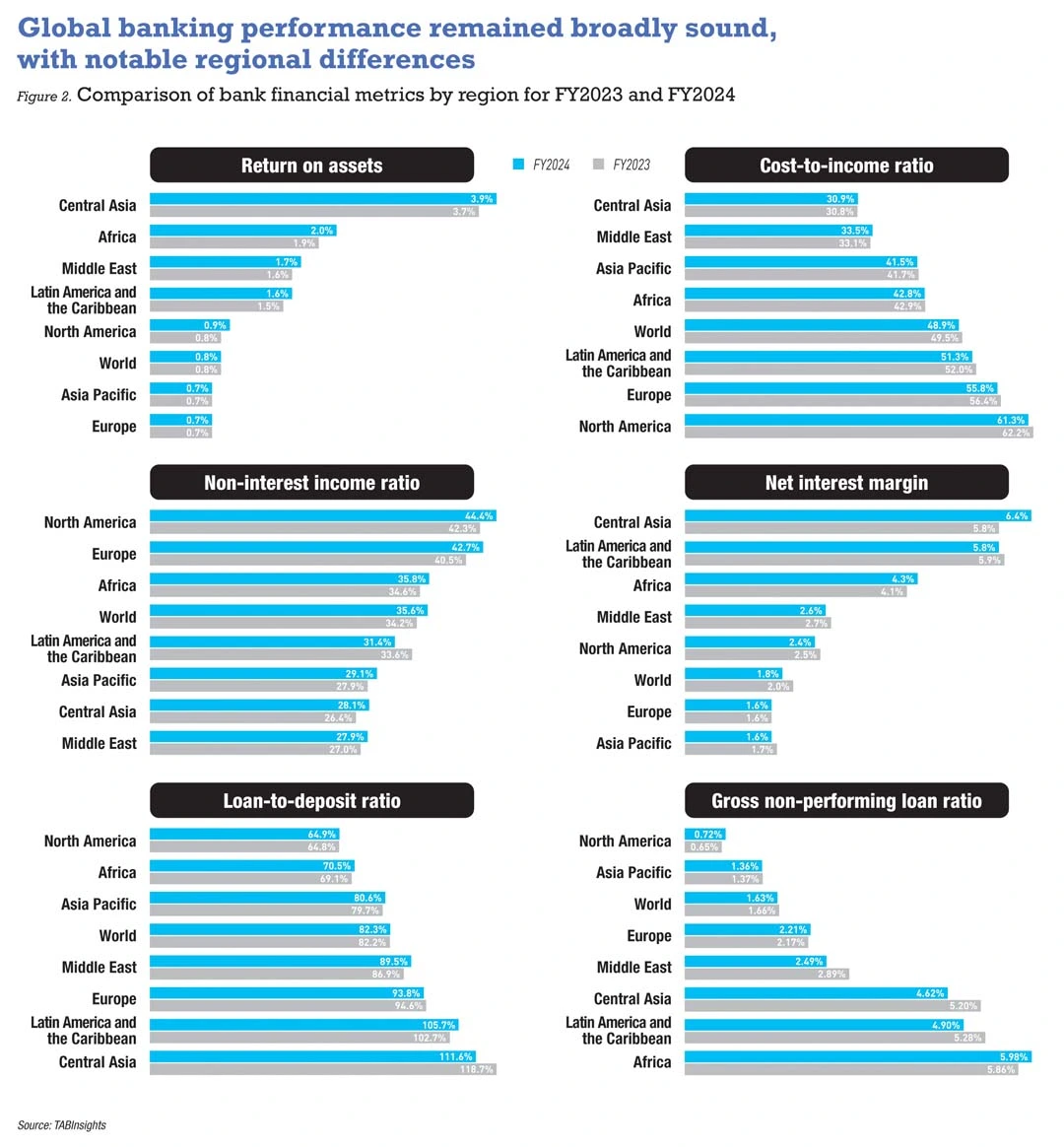 Income diversification advanced gradually, with non-interest income rising from 34.2% to 35.6% of total operating income. Mature markets showed stronger diversification through fee-based income, while emerging markets — particularly Asia Pacific, the Middle East and Central Asia — remained lending-dependent, with non-interest income ratios below 30%.