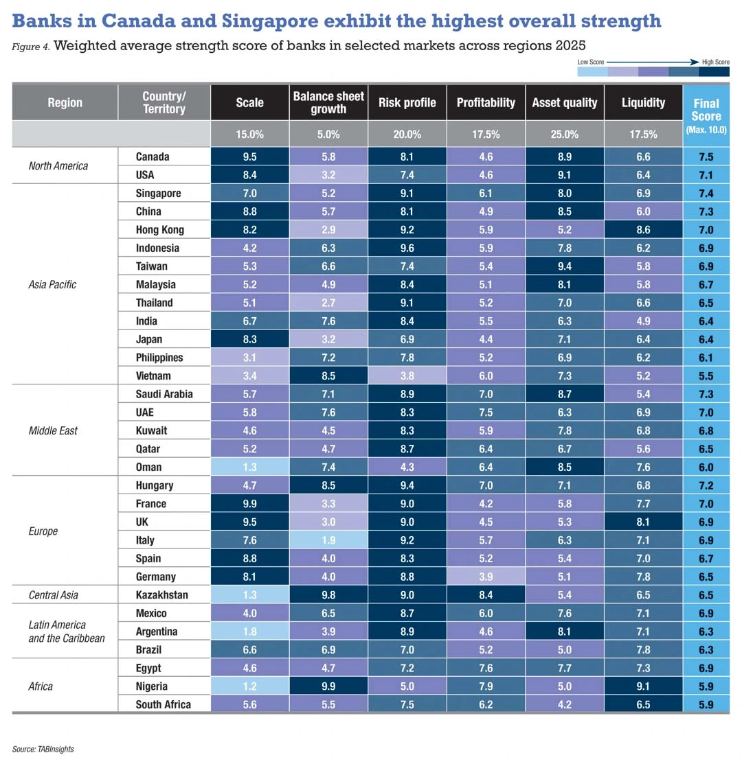 Overall, the 2025 edition of the TAB Global 1000 World’s Strongest Banks ranking underscores the resilience and adaptability of the global banking sector amid diverse operating conditions. Regional variations remain evident, but leading banks continue to strengthen capital, liquidity and diversification, reinforcing stability and competitiveness. As regulatory frameworks evolve and technological transformation accelerates, banks’ ability to balance growth, efficiency and prudent risk management will remain decisive for sustaining long-term strength.